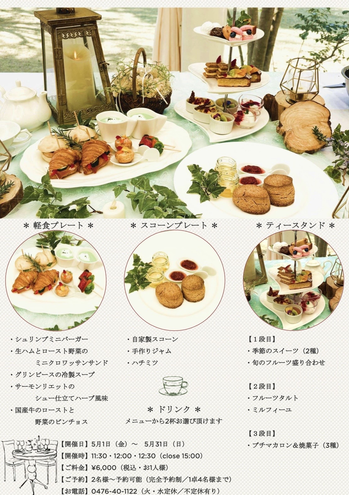 2026.03.12 アンソレイエ5月レストラン情報 ~アフタヌーンティー アンソレイエ~ ≪大好評につき待望の第2弾‼≫ 5/1(金)~5/31(日)の期間限定でアンソレイエアフタヌーンティーを開催いたします。 ティースタンド・軽食・スコーン・ドリンク2杯がついたスペシャルコースとなっております。 皆様のご予約・ご来店お待ちしております。 ※ご予約はお電話にて承っております。