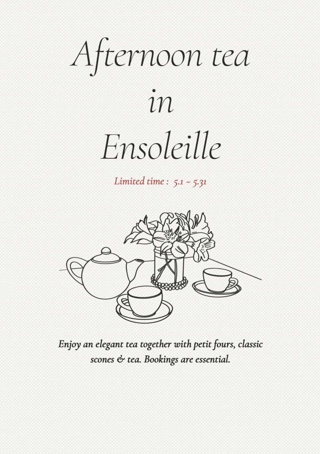 2026.03.12 アンソレイエ5月レストラン情報 ~アフタヌーンティー アンソレイエ~ ≪大好評につき待望の第2弾‼≫ 5/1(金)~5/31(日)の期間限定でアンソレイエアフタヌーンティーを開催いたします。 ティースタンド・軽食・スコーン・ドリンク2杯がついたスペシャルコースとなっております。 皆様のご予約・ご来店お待ちしております。 ※ご予約はお電話にて承っております。 < 前へ 一覧 ブログテーマ一覧 プラン NEWS ランチ ディナー 過去の記事 2026年3月 2026年2月 2025年11月 2025年3月 2025年1月 2024年1月 2023年11月