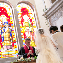 フランスの教会から譲り受けたというステンドグラスが印象的なチャペルで、ゲスト全員に見守られながら、穏やかで温かい気持ちの式を挙げることができました。